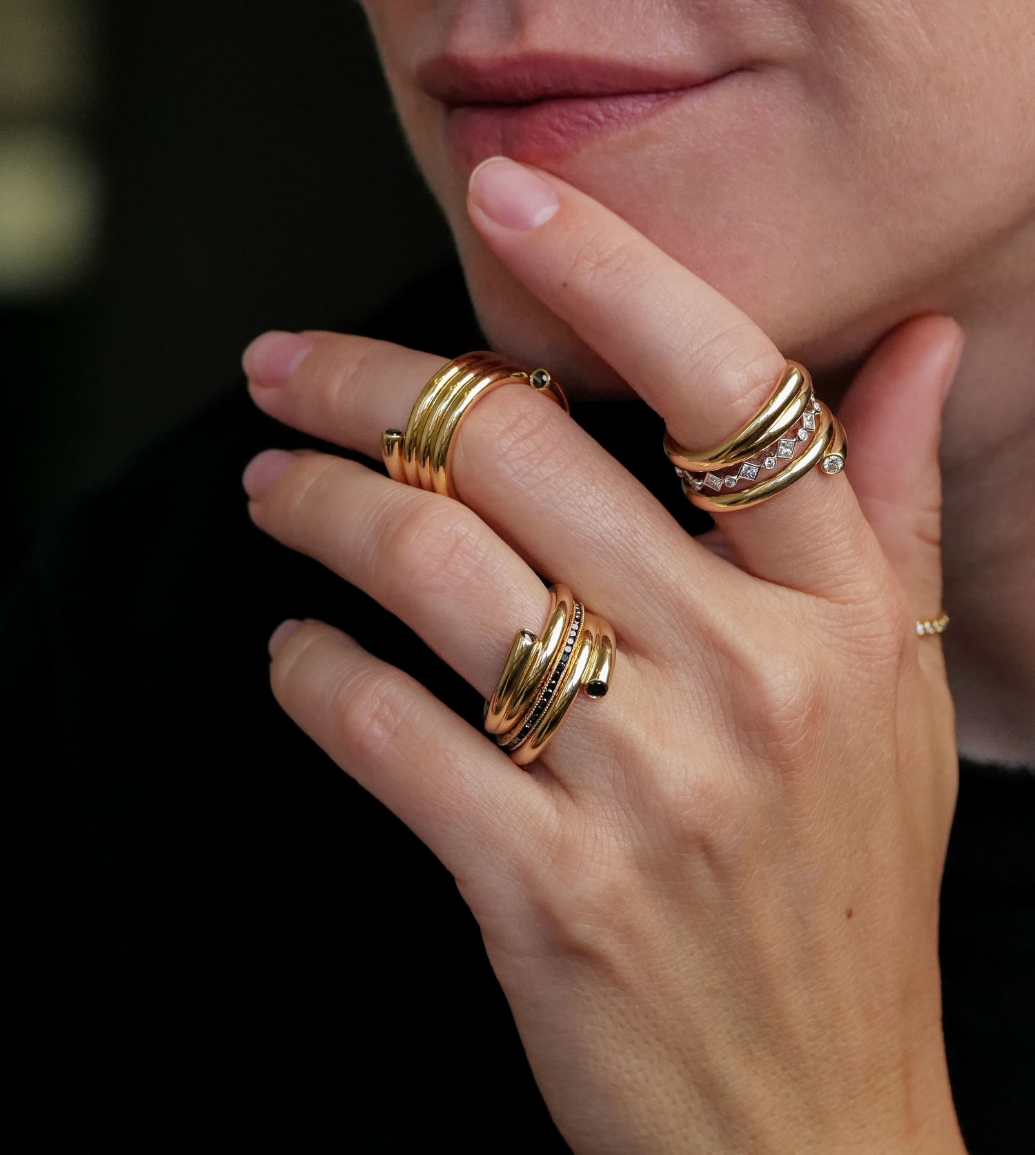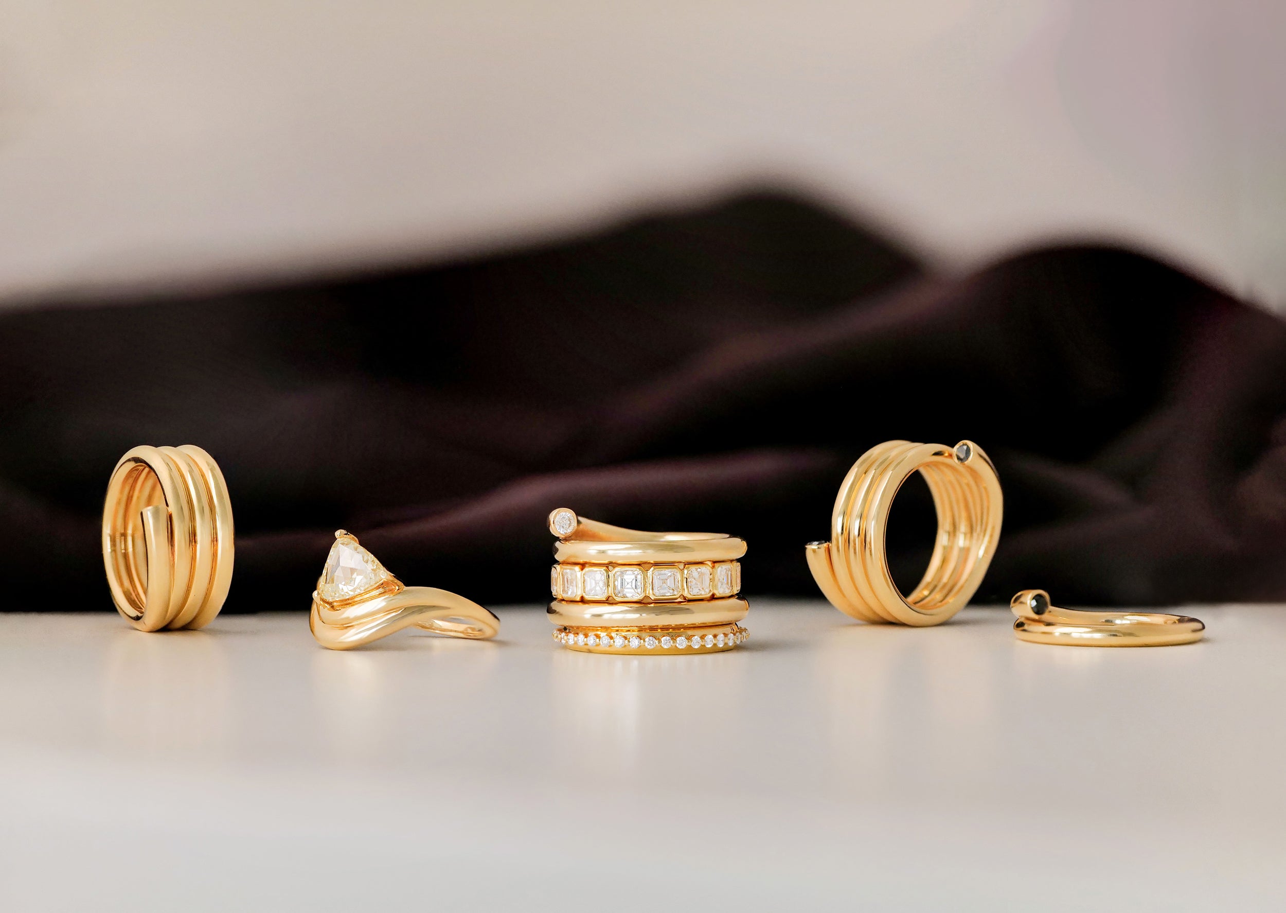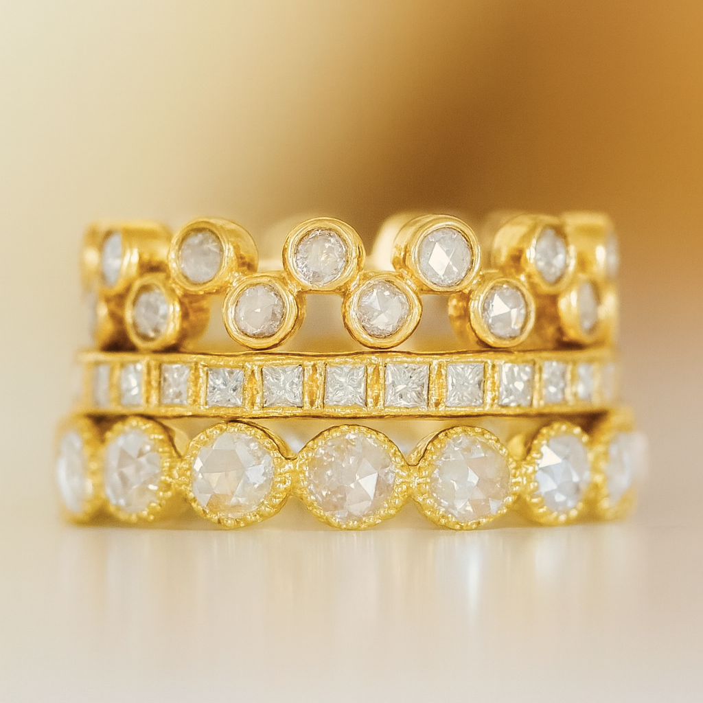 Meet Ziya, a vibrant ring stack of rose-cut and princess-cut diamonds set in warm yellow gold. With its intricate shapes and lively details, Ziya embodies enthusiasm, joy, and celebration, sparkling like a glass of bubbly, full of effervescence and charm. Its radiant design captures the spirit of festivity, making it the perfect accessory for the holiday season or any moment that calls for glamour and cheer.