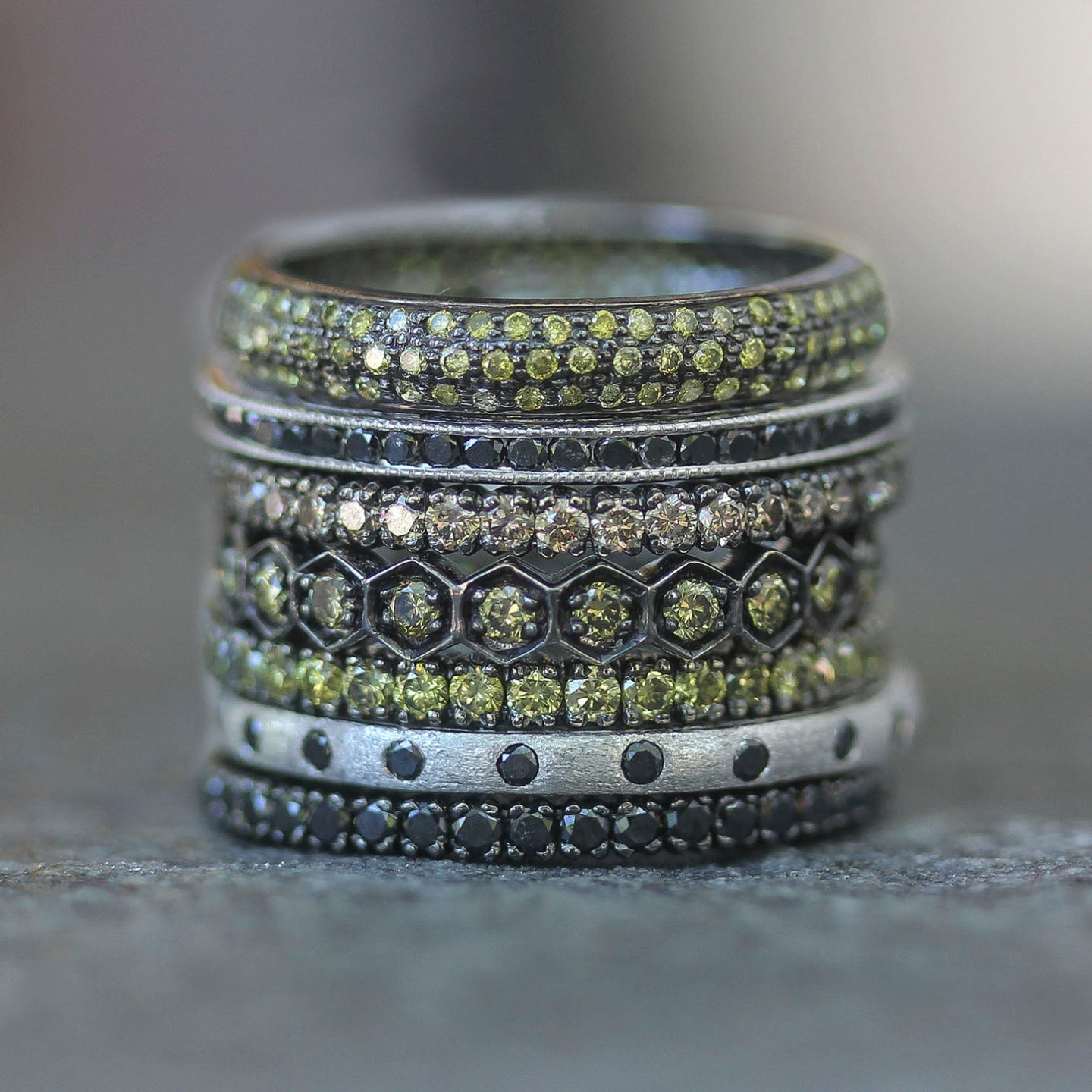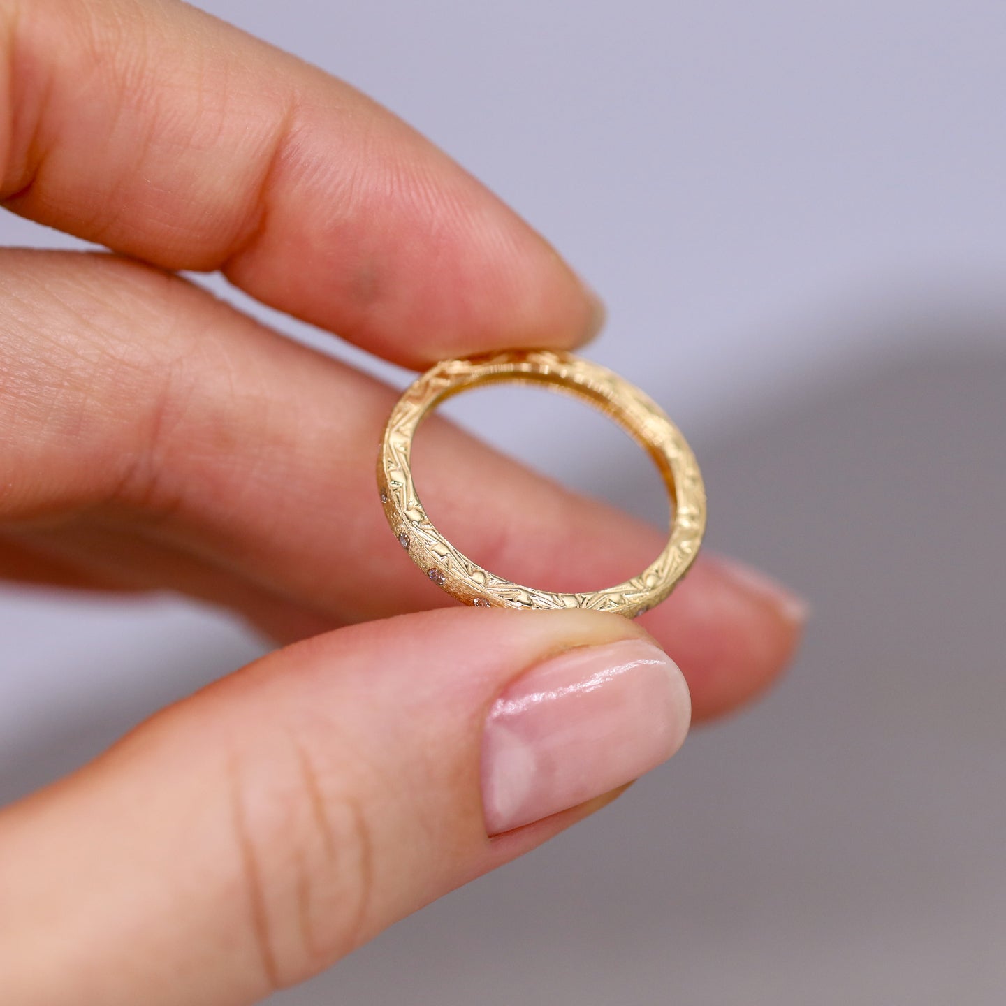 A staple of our Dunes Collection, the Dunes Narrow Black Diamond Band blends our Indian Heritage with our California roots. Glossy black diamonds, signature engraving and a brushed gold finish. Also available with white diamonds or multi-color diamonds.
