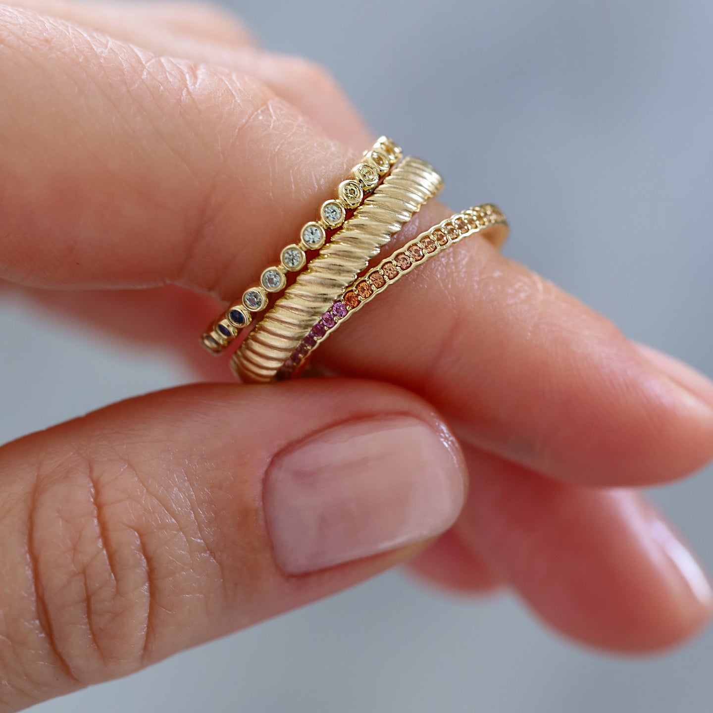 The Scallop Band has joined the Rainbow Sapphire Collection. An energizing accent to your stack story, with hues of pink, orange, yellow, green and blue.