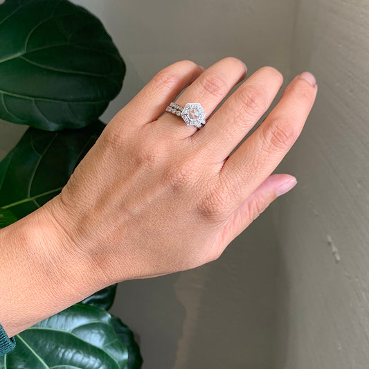 The Silhouette and Lucy White Diamond Signature Bands complement this cushion cut vintage diamond ring.