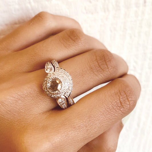 A classic reminder of your love's celebration, with vintage-inspired timeless touches of rose cut diamonds and milgrain detail.