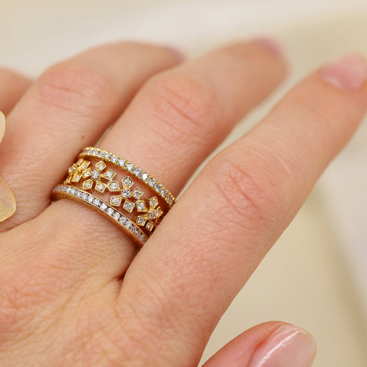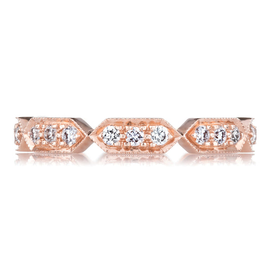 Rose cut diamonds, brushed gold and milgrain details tailor your forever heirloom.