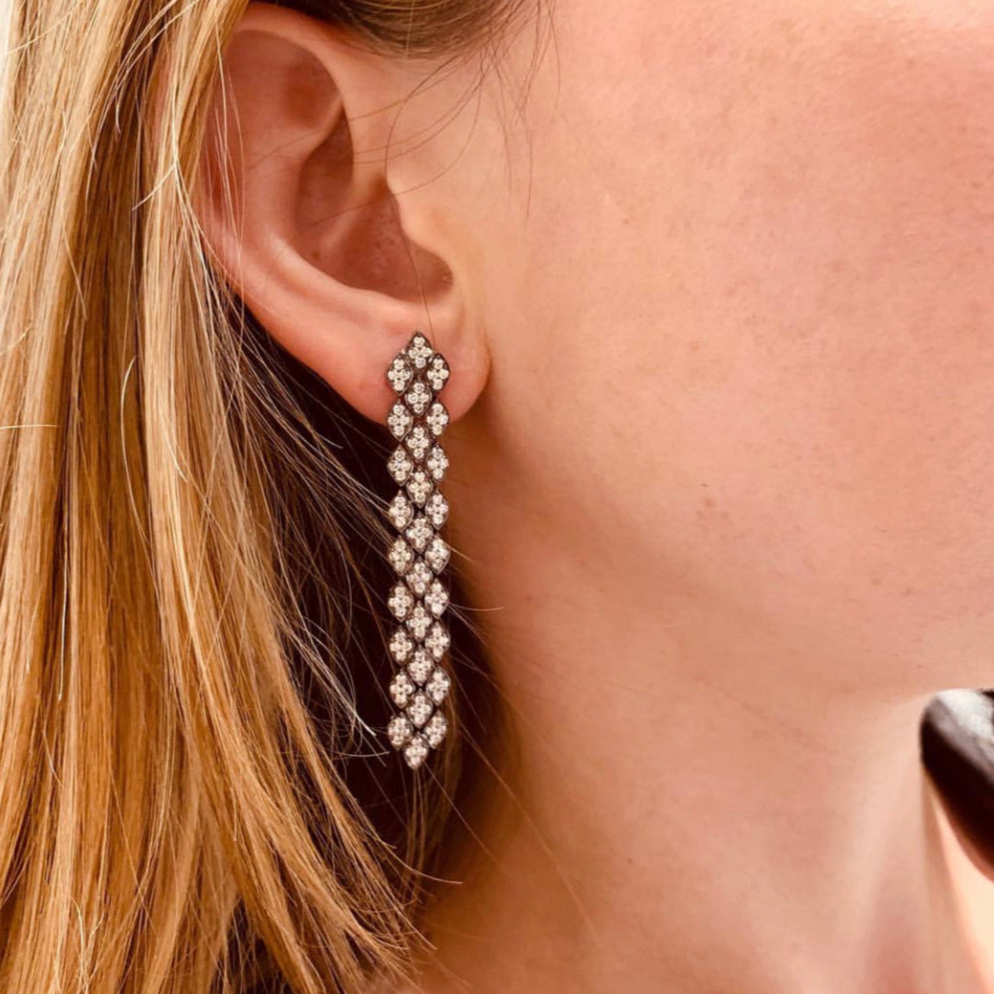 The Darcy White Diamond Chandelier Earrings are all grace and charm, with sparkling brilliant cut white diamonds lined within curved contours.