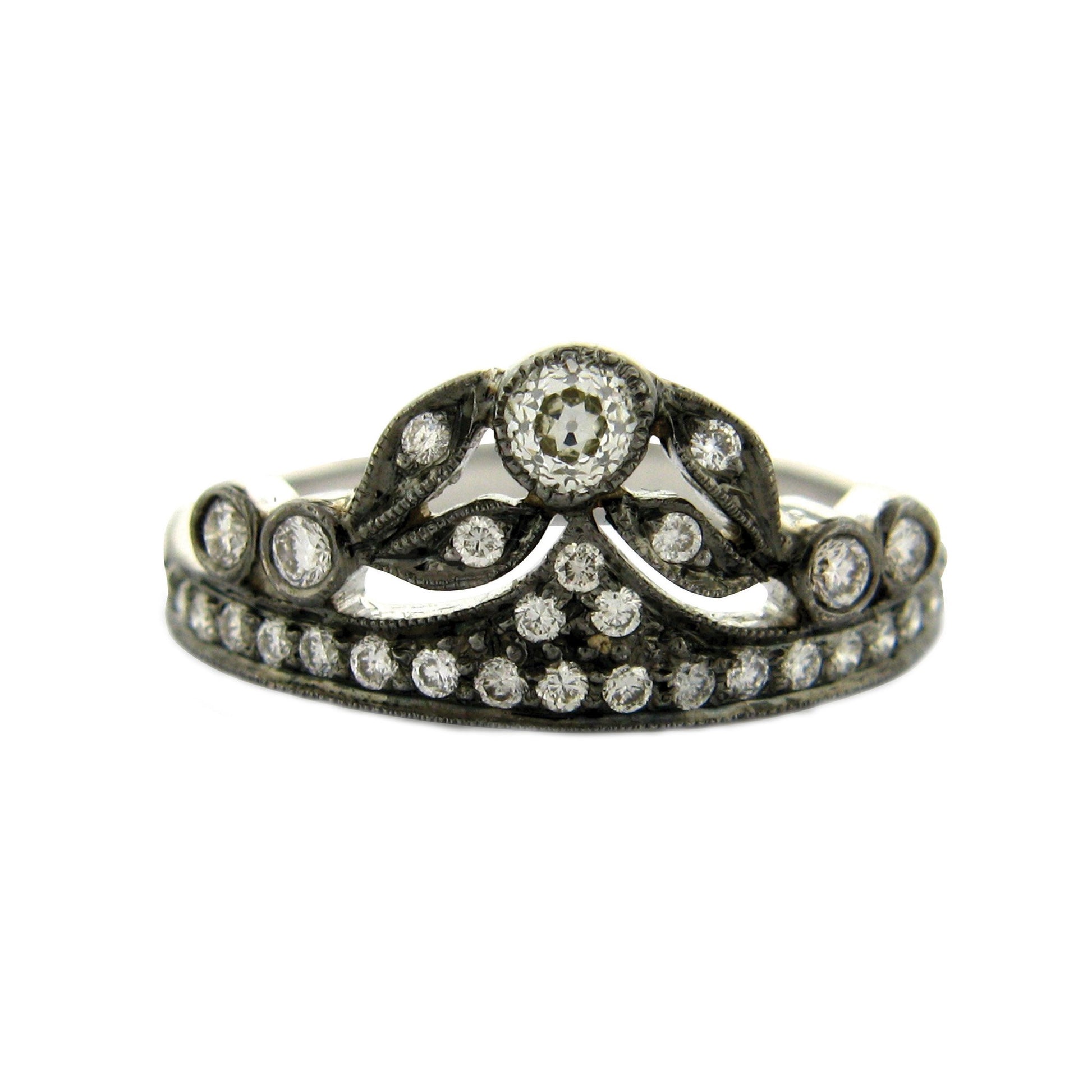 Rule like royalty in the Elizabeth White Diamond Ring. Sparkling old mine and brilliant cut white diamonds glow within a vintage vibe of blackened gold.