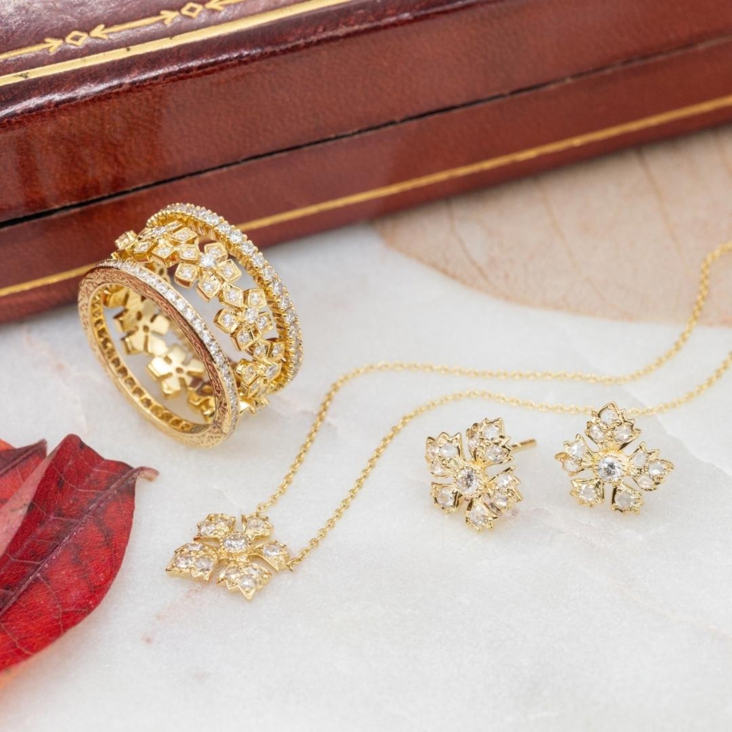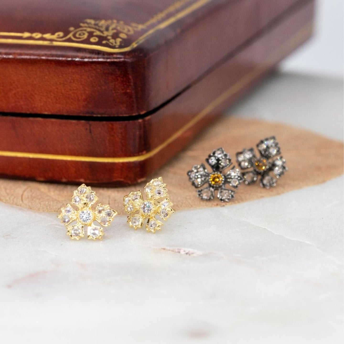 Our Enchanted Garden White Diamond Stud Earrings are an inspired showcase of feminine botanicals, with leaves of rose cut white diamonds framing a single brilliant cut white diamond center. Made to match with our Enchanted Garden White Diamond Necklace.