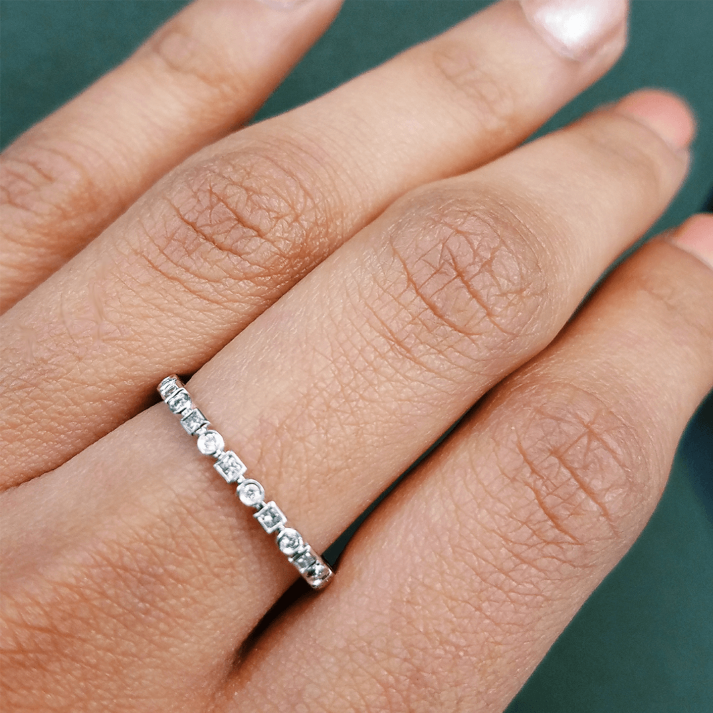 An intricate trace of Art Deco style, the Kate White Diamond Band is a dance of brilliant and princess cut white diamonds along the line of a perfect eternity stacking ring. Up the ante with our Kate Three Row White Diamond Band.