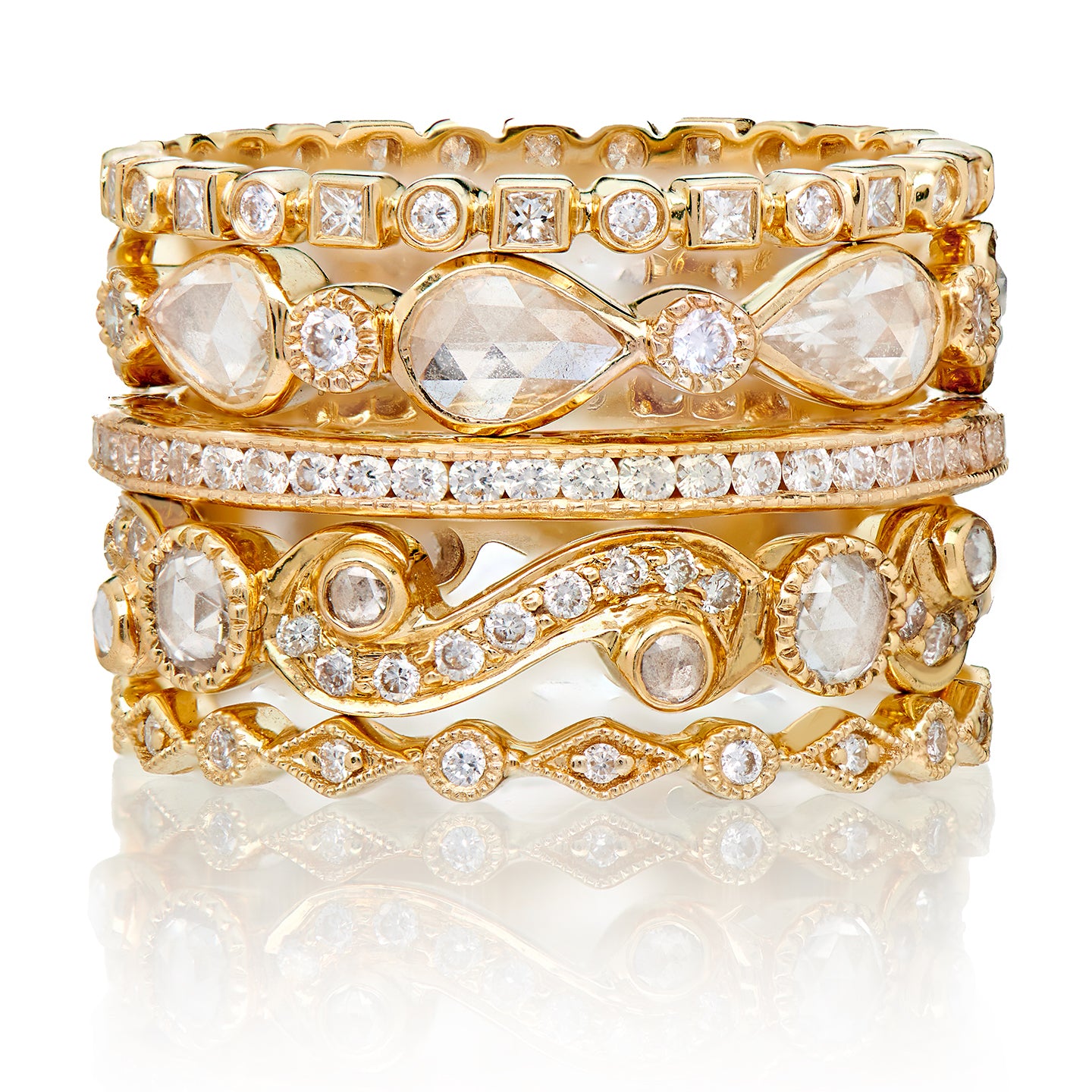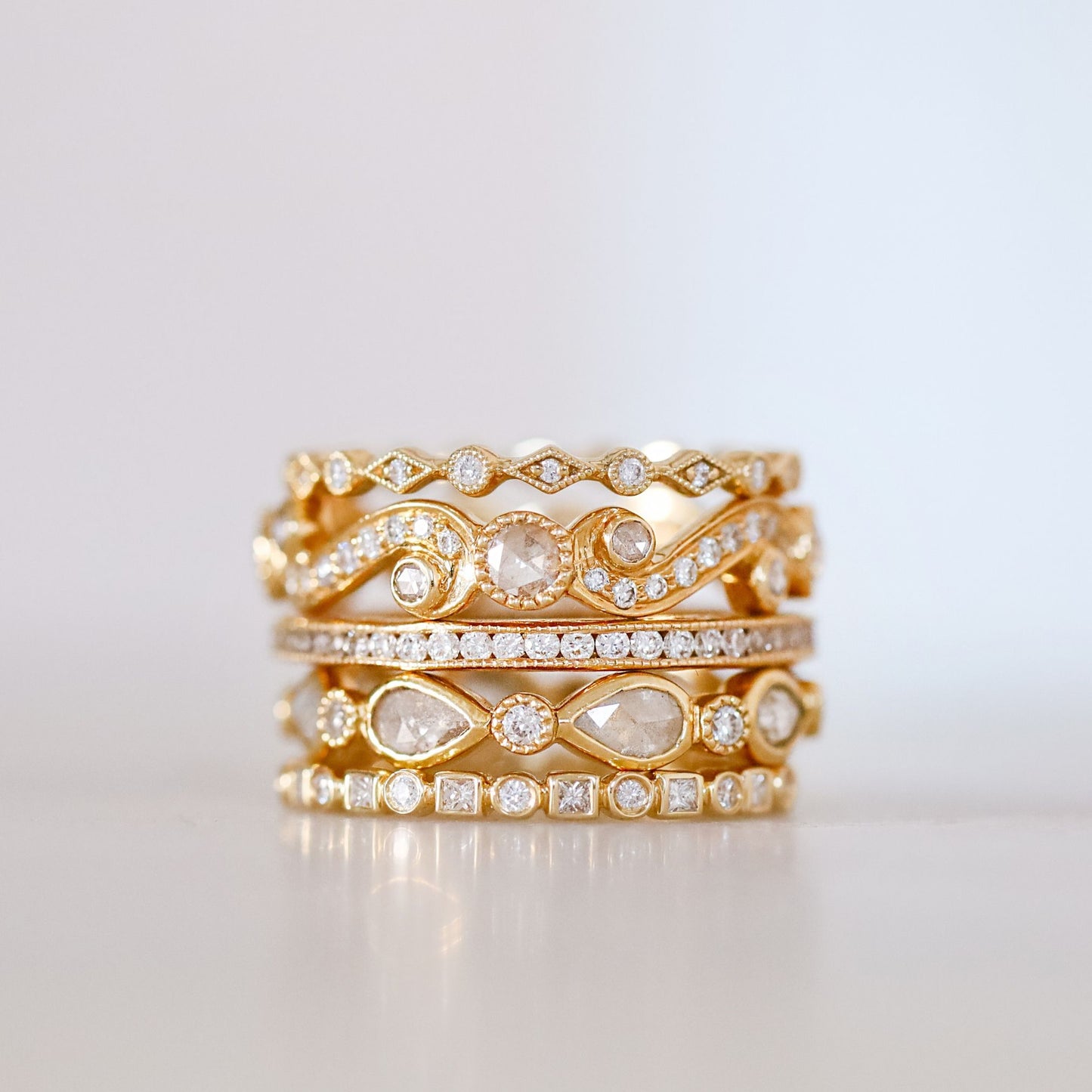 Breathtakingly beautiful and utterly charming, Belle is a Sethi Stack of feminine features and unique-shaped diamonds set in 18K yellow gold. This curated ring stack combines a classic channel-set eternity band with stunning vintage-inspired designs and intricate milgrain details. Sparkling with confidence and timeless charm, Belle captivates and leaves an unforgettable impression.