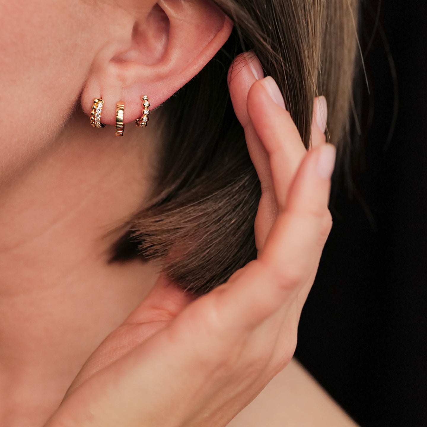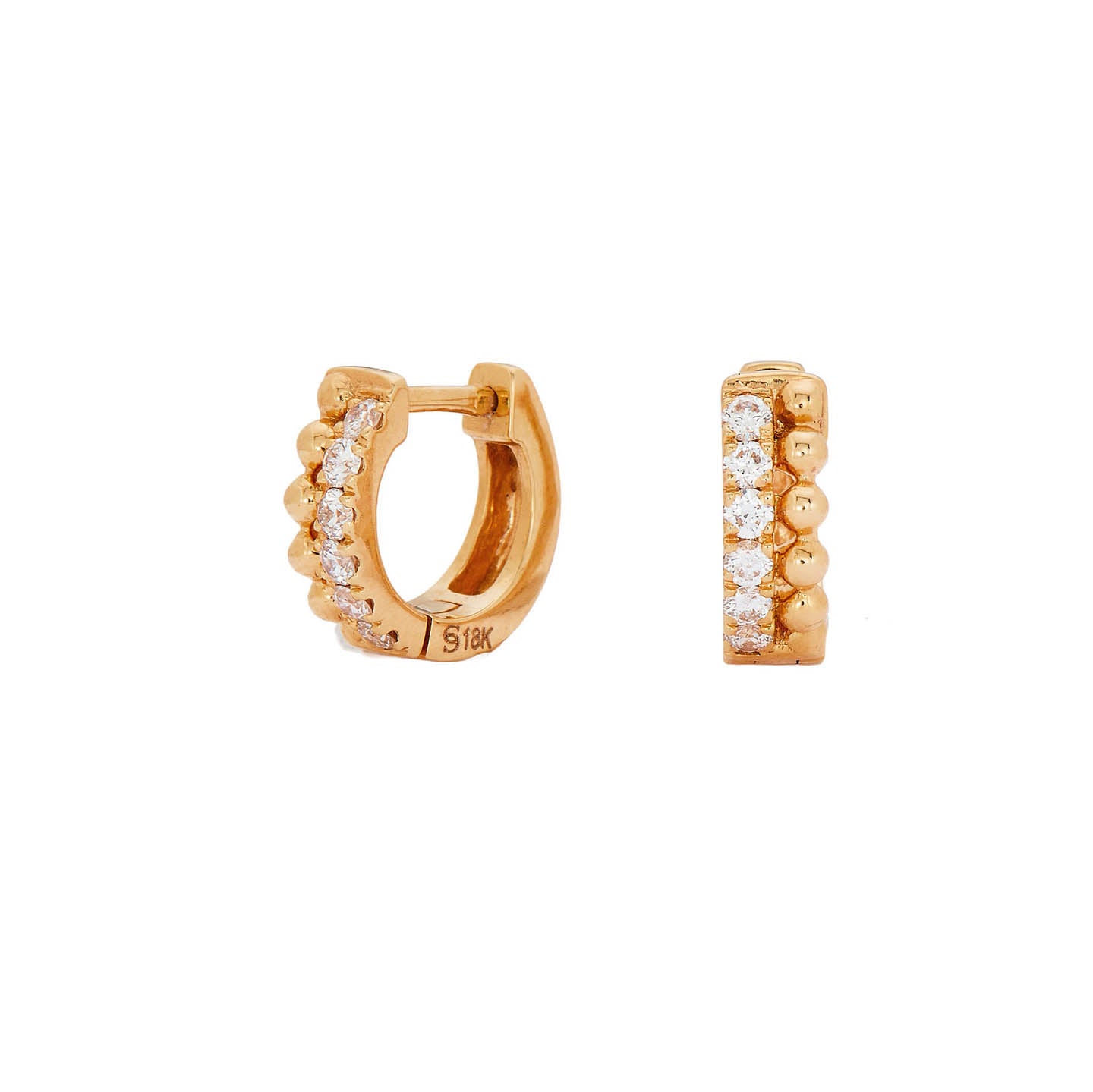 The Tiia White and Gold Double Row Diamond Huggies bring a refined edge to classic elegance. Designed with two contrasting rows—one of sparkling white diamonds and the other of textured 18K yellow gold—they create the illusion of a perfectly layered double huggy.
