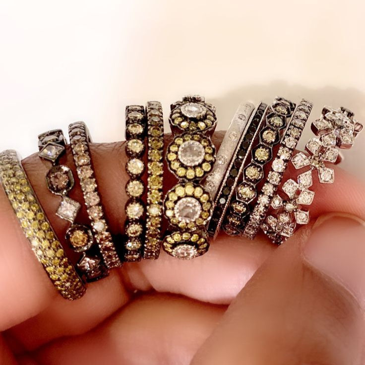 The True Romance 5 Stone Green Diamond Ring is a two-tone, half-eternity style ring of romantic rose cut bouquets, glittering along scallops of brilliant cut diamonds to be cherished for generations to come.